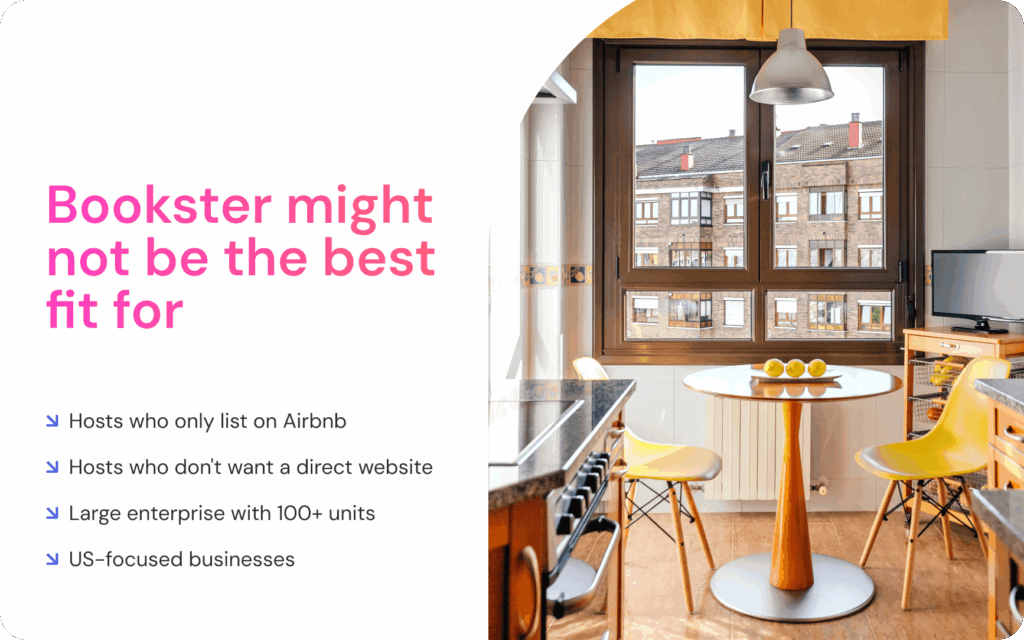 Besides, Bookster may not be the best choice for hotel managers that run multiple rooms and need a more comprehensive solution.