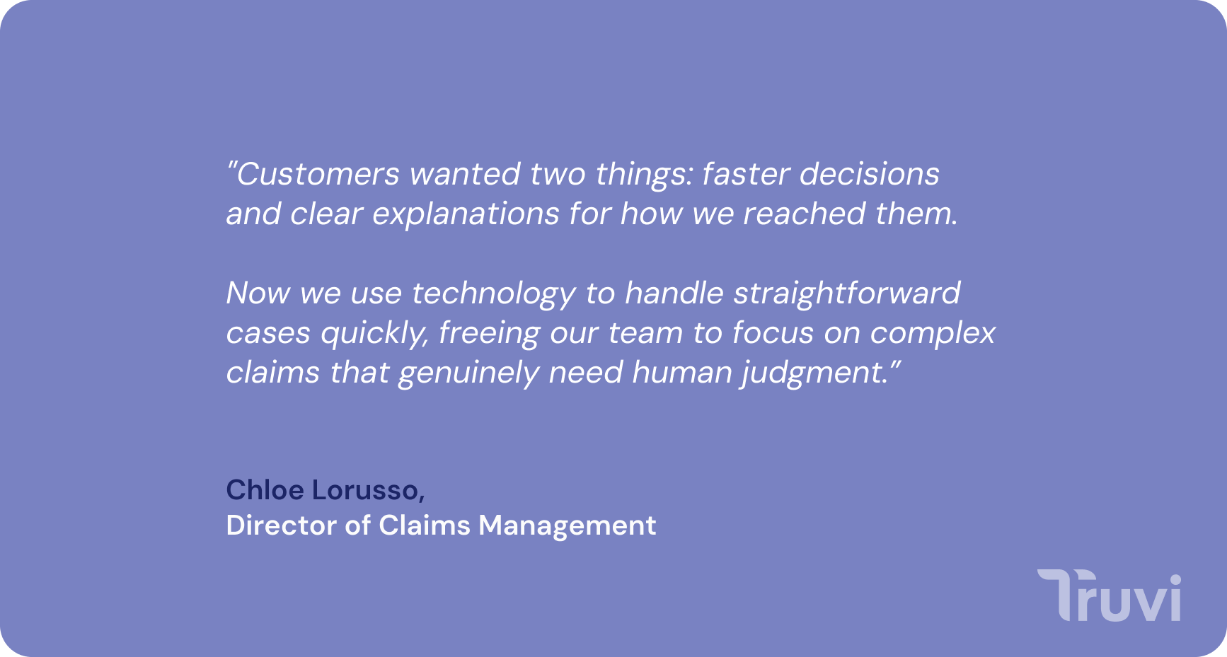 “We built this system because our customers told us they wanted two things: faster decisions and clear explanations for how we reached them,” says Chloe Lorusso, our Director of Claims Management. “The old way — manual review for every claim — was slow and opaque. Now we use technology to handle straightforward cases quickly, which frees our team to focus on the complex situations that genuinely need human judgment.”
