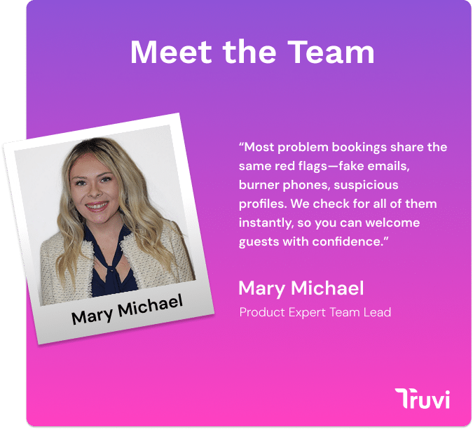 Truvi’s screening runs automatically on every booking with no guest interaction required. We check the guest’s name against our internal watchlist of guests who previously caused damage and refused to pay, verify their phone number is deliverable and not disposable, and confirm their email is deliverable and not temporary. Results appear instantly in your booking report with a status of Approved, Flagged, or Rejected based on what we find.